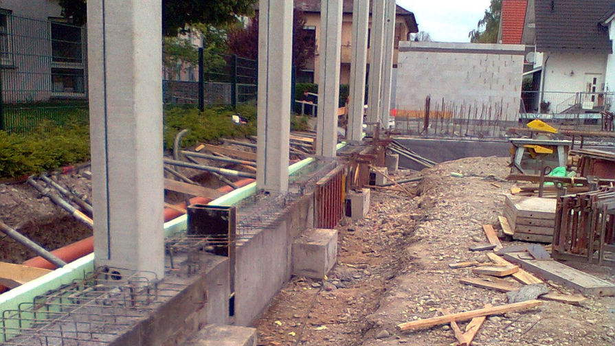 Alte Kellerräume von früheren Gebäuden teilweise freigelegt, mit Beton/Schotter verfüllt